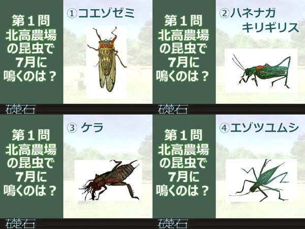 「第一問、北高農場の昆虫で7月に鳴くのは? 」今沢くん手書きの虫の絵がすばらしいです!